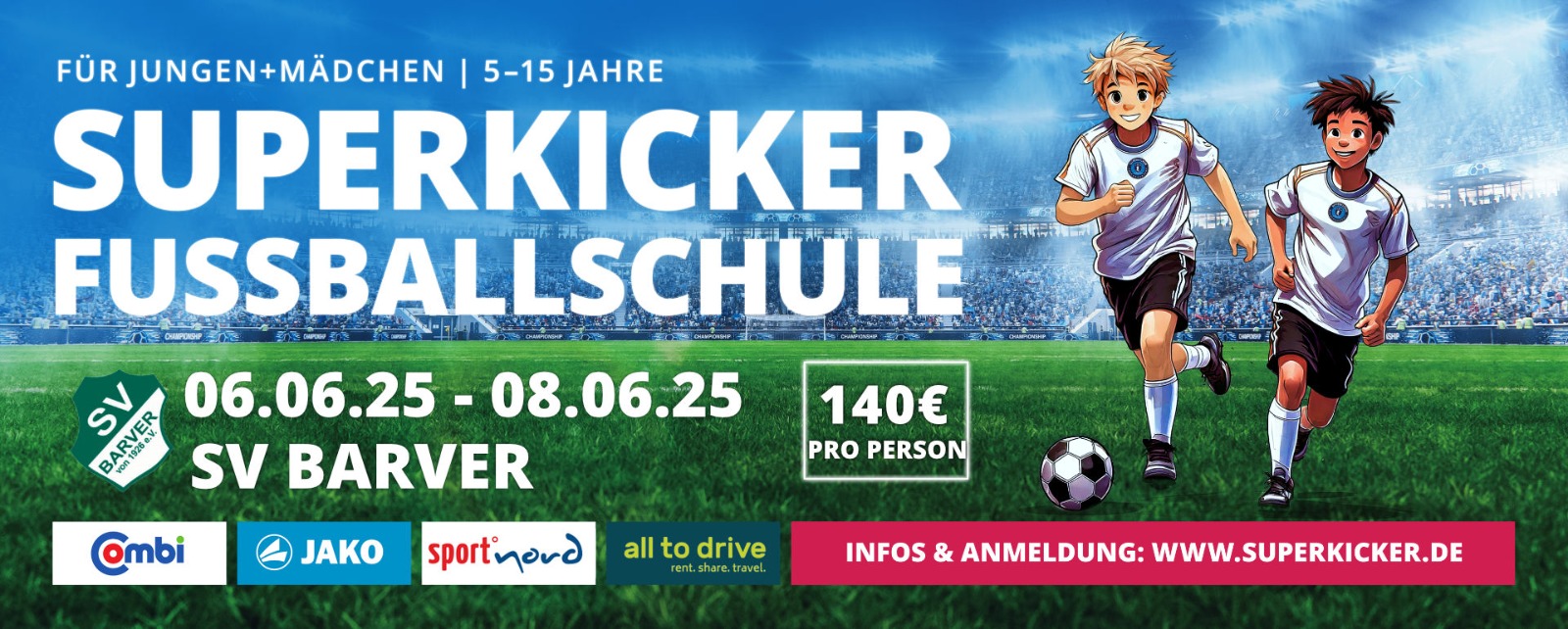 Auch in diesem Jahr, bietet der SV Barver wieder eine Fussballschule über Pfingsten an. Interessierte Fußballer können sich gerne unter https://www.11sportevemts.de/detail/fussballcamp-sv-barver anmelden. Dort findet ihr auch weiter Informationen zum Camp.