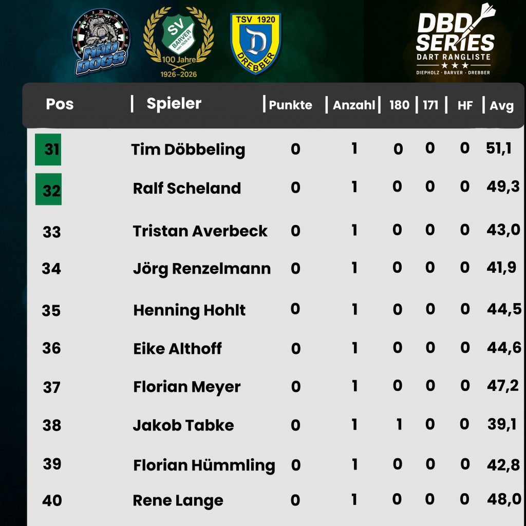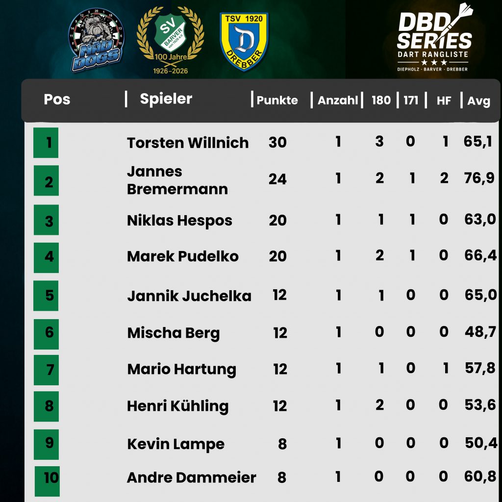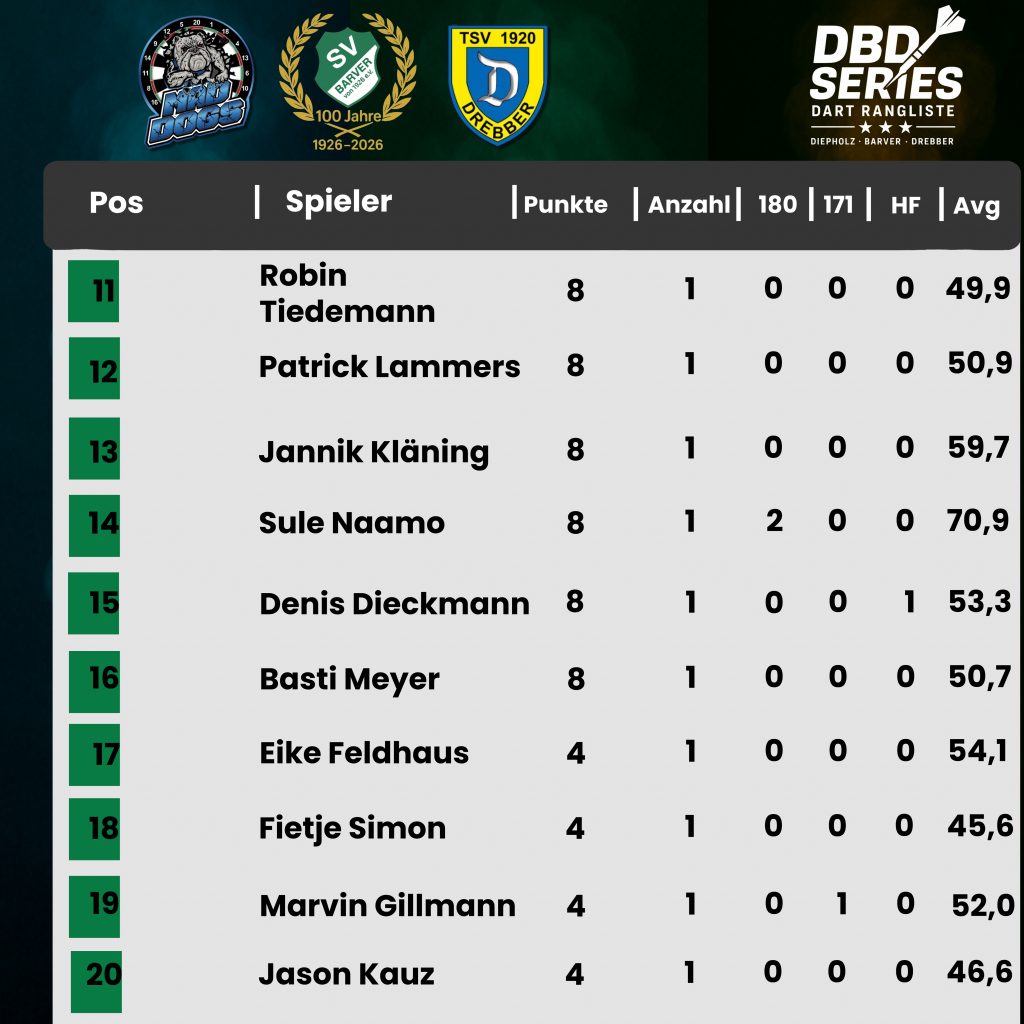 Die Rangliste der DBD setzt sich wie folgt zusammen:
